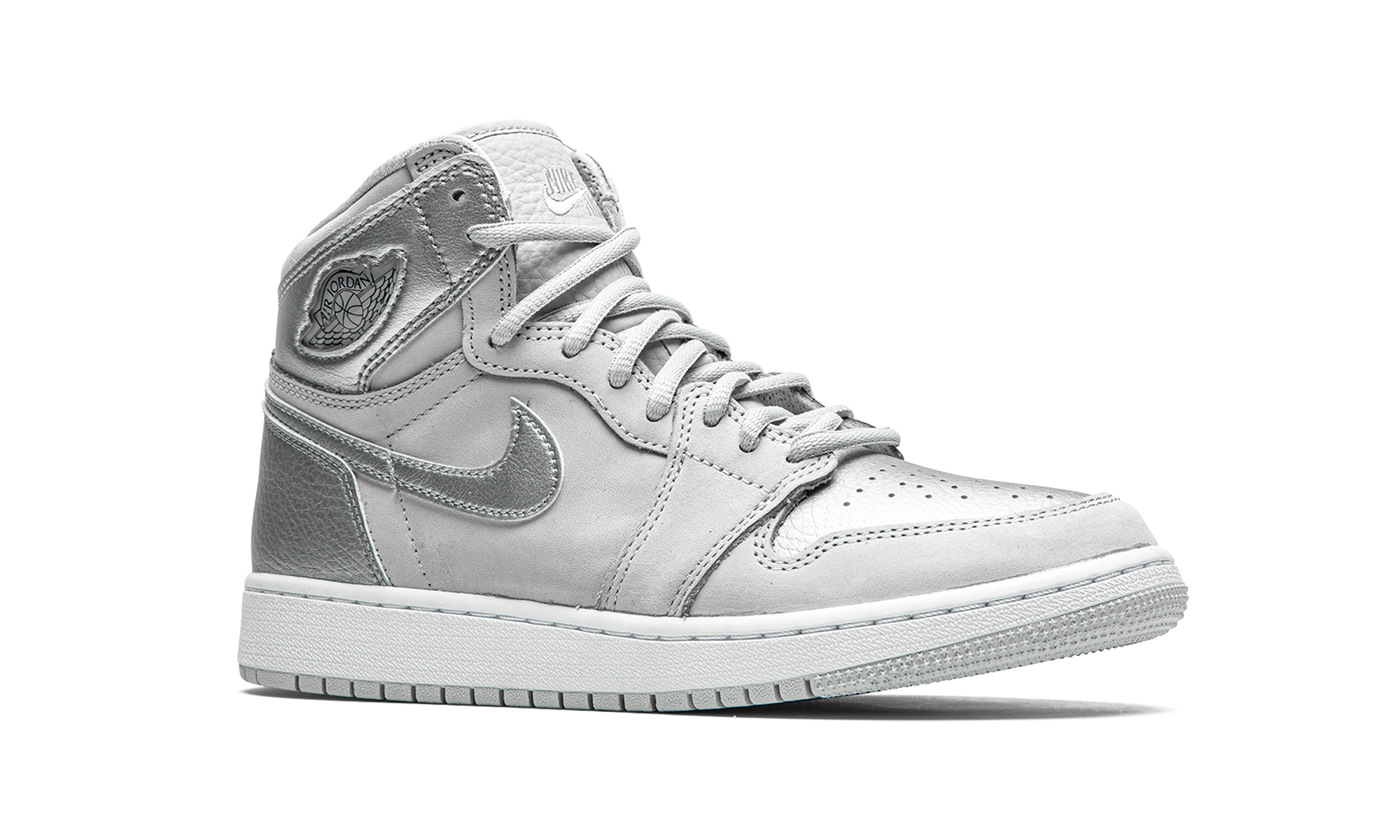 The Air Jordan 1 Co.Jp GS “Metallic Silver” is a modern reinterpretation of the limited edition, Japan-exclusive colorway that was originally released in 2001. Given a somewhat wider global release, this youth sizing of the Jordan 1 Co.Jp “Metallic Silver” now features a “Nike Air” branded tongue tag, unlike the previous version of the shoe from nearly two decades ago. The upper is dressed in a similar neutral color scheme, with grey nubuck being visible on the mid-panel, forefoot, and toe cap. Shiny Metallic Silver leather dots the perforated toe, Swoosh detailing on either side, heel, and collar. While the 2001 iteration displayed a gold accented “Wings” logo on the collar, the 2020 release features tonal “Wings” branding on the leather overlay. Embroidered “Nike Air” is stitched onto the grey tumbled leather tongue. Unique “Co.Jp” branding can be found on the insole. Release date: August 7, 2020.