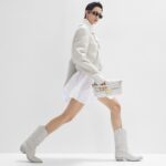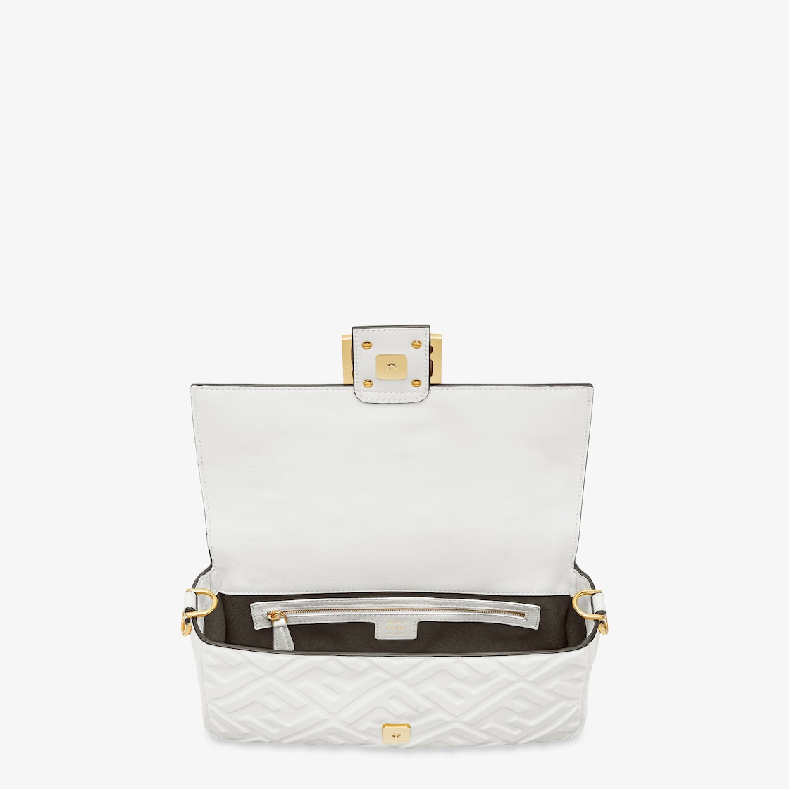 Iconic medium Baguette bag made of white soft nappa leather with a three-dimensional texture FF motif. Decorated with an FF clasp.