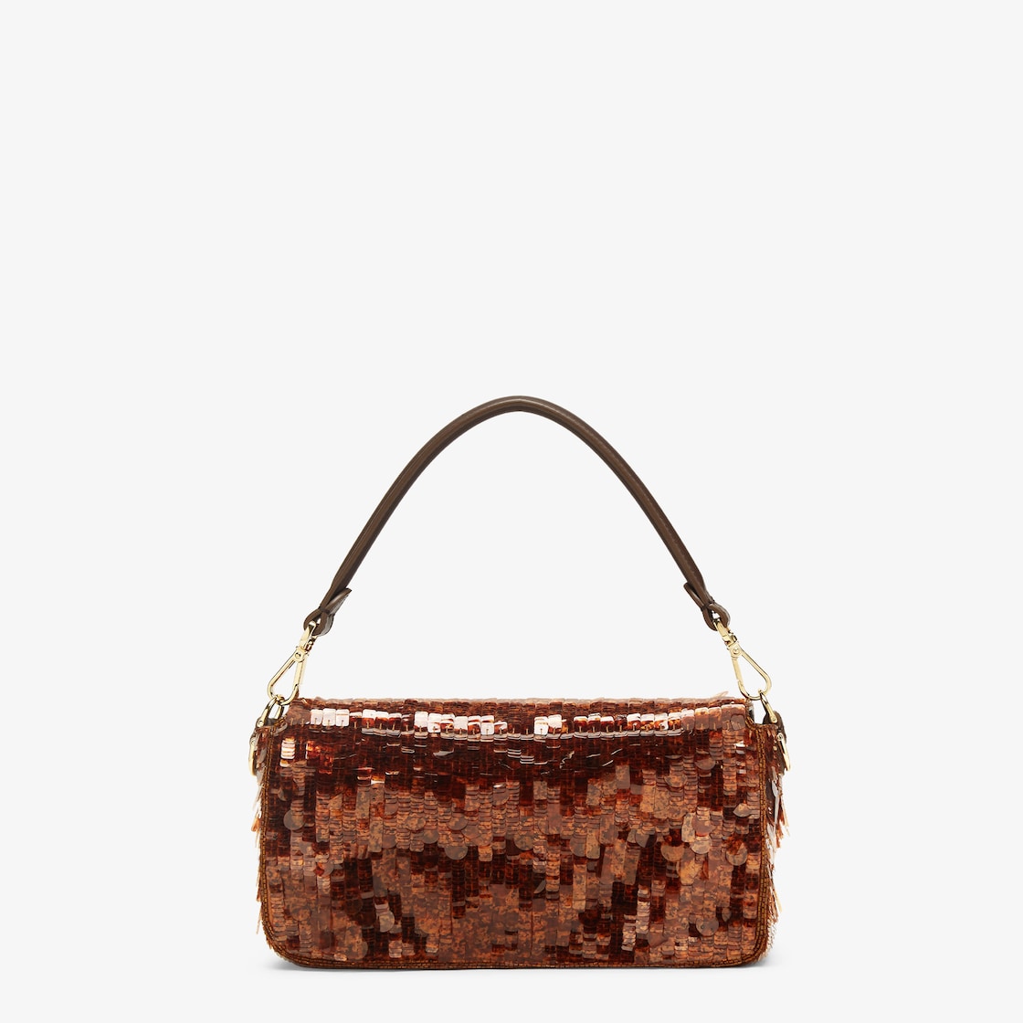Hand-embroidered with brown tortoiseshell-effect sequins of different shapes and sizes. Trimmed in brown calfskin and embellished with an FF clasp with tortoiseshell plexiglass filling.
