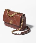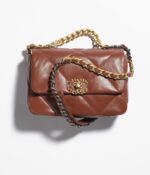 The Medium 19 Flap Bag is crafted in caramel lambskin with mixed metal hardware and features signature diamond quilting, signature CC interlocking clasp, exterior back pocket, chain top handle and long mixed metal and caramel leather chain