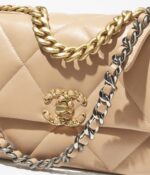 The Medium 19 Flap Bag is crafted from light beige lambskin with mixed metal hardware and features signature diamond quilting, signature CC interlocking clasp, exterior back pocket, chain top handle and long mixed metal and light beige leather chain