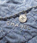 This small 22 Hobo bag is made of blue stitched denim with silver hardware, signature diamond quilting and small silver rivets on the front and bag, silver metal “Chanel” logo on the front, Chanel Paris metal hangtag, silver metal interwoven chain links, blue leather shoulder strap and a long leather cord.