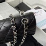 This small classic double flap bag is crafted in black lambskin with silver hardware, featuring the signature CC turnlock closure on the front flap, half-moon back pockets, adjustable silver interwoven chain links and a black leather shoulder strap.