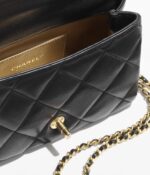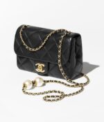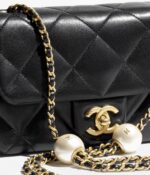 This Chanel Square Double Bead Flap Bag is crafted in black lambskin with brushed gold hardware, front flap with signature CC turnlock closure, tonal stitching, single interwoven black leather and brushed gold chain link pearl shoulder/crossbody strap.