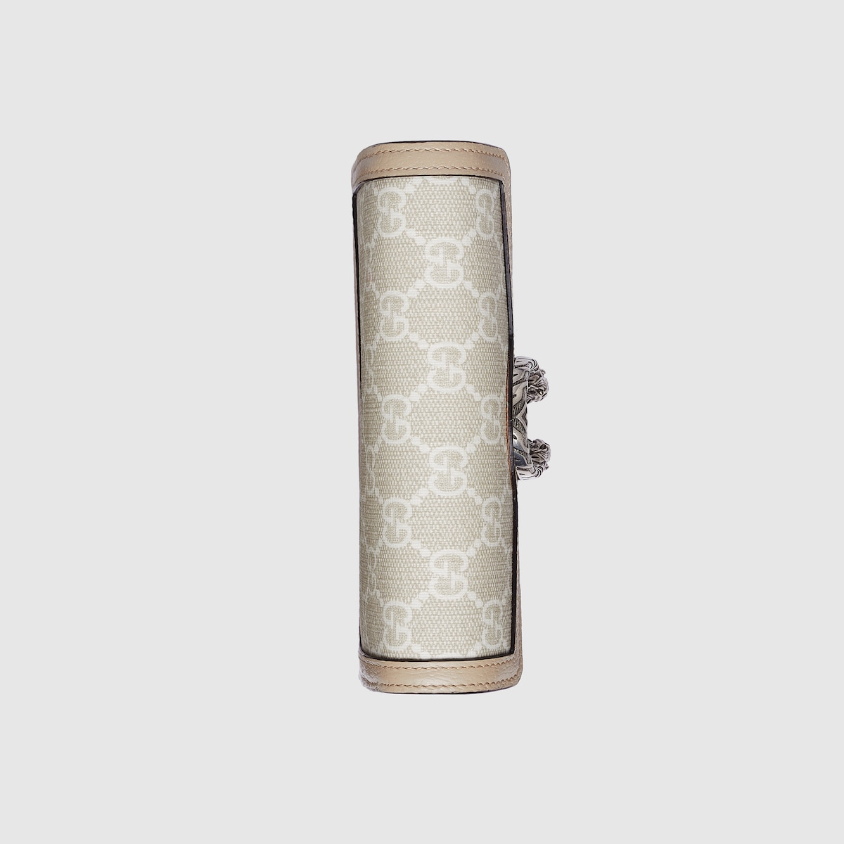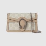 A new edition of the Dionysus is showcased throughout Gucci Love Parade. The bag is presented in a super mini size in an evolution of the classic GG Supreme canvas. A soft color palette, the petite design takes on a refined feel in the colors of beige and white, drawing attention to its recognizable tiger head hardware.