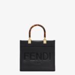 Small Sunshine Shopper bag made of black leather with hot-stamped FENDI ROMA lettering and stiff tortoiseshell plexiglass handles.