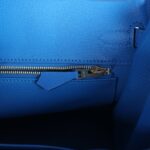 The interior is lined with Bleu Hydra chevre and has one zip pocket with an Hermès engraved zipper pull and an open pocket on the opposite side.