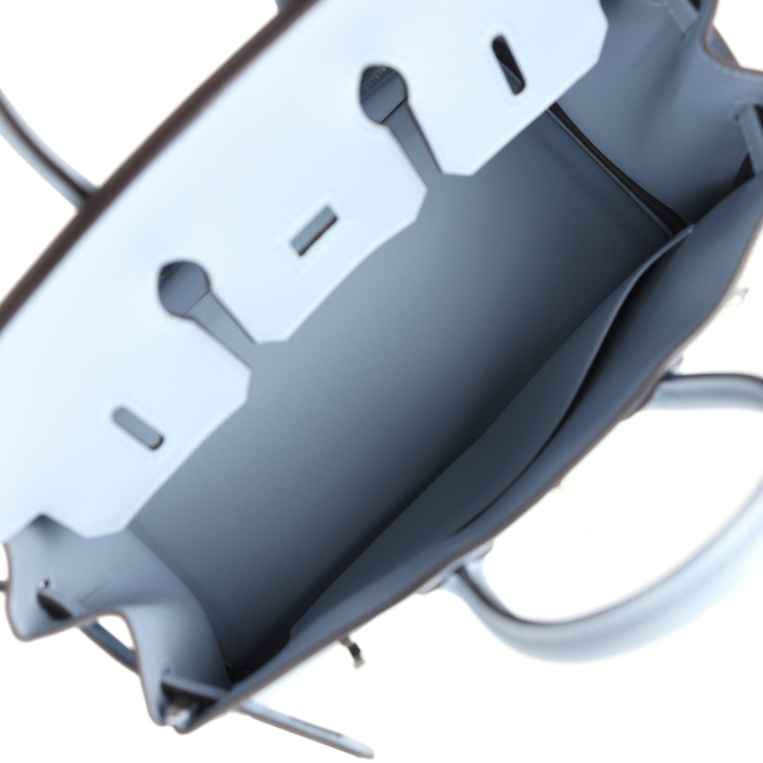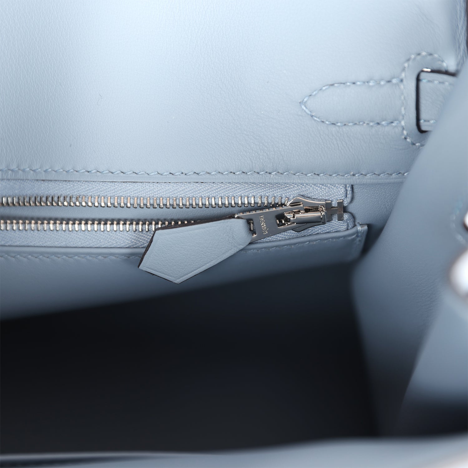 The interior is lined with Bleu Lin swift and has one zip pocket with an Hermès engraved zipper pull and an open pocket on the opposite side.