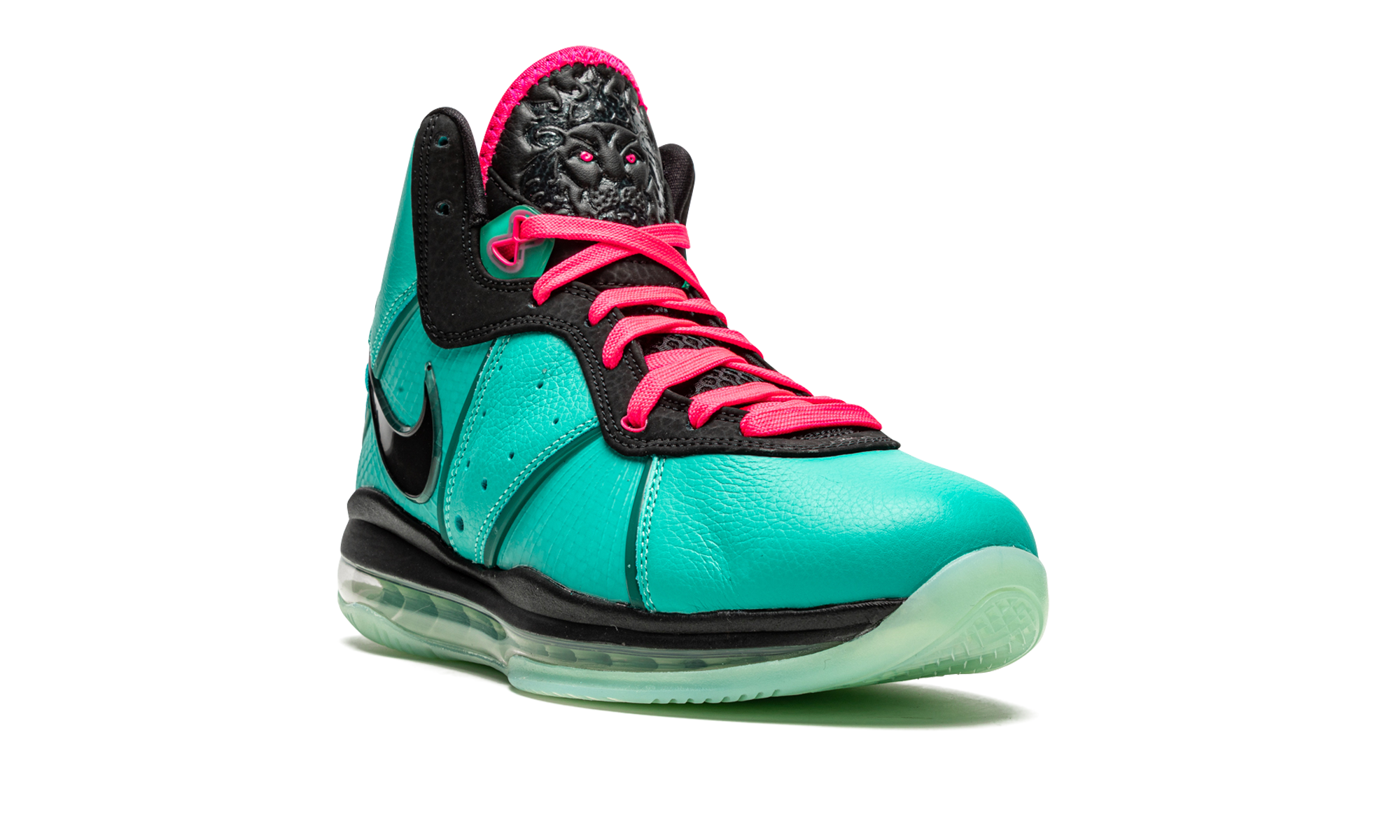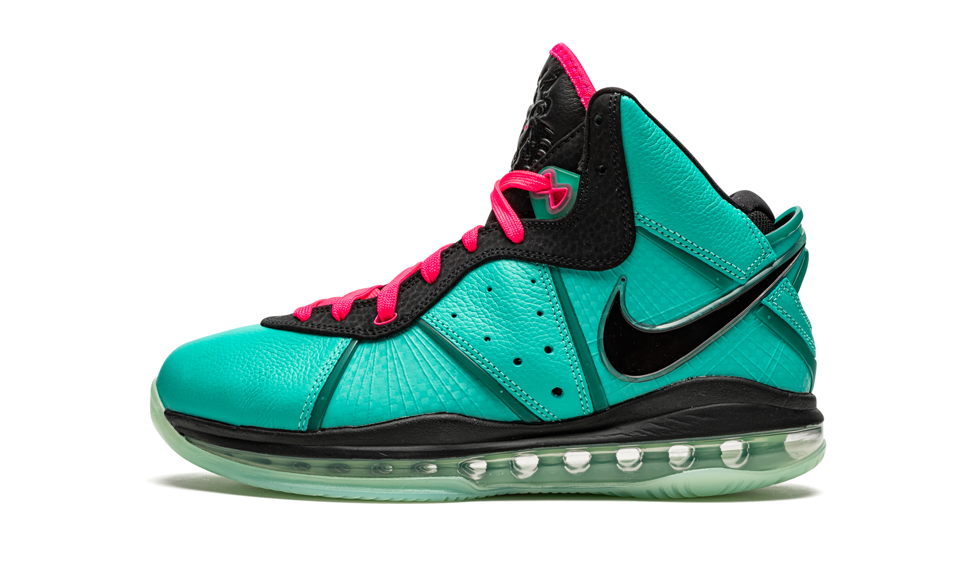 The Nike LeBron 8 “South Beach 2021” is a modern re-release of perhaps the most iconic colorway in LeBron James’ signature shoe collection with Nike Basketball. Launching as a pre-heat colorway prior to LeBron’s tenure with the Miami Heat in 2010, the “South Beach” Nike LeBron 8 played an important role in advancing sneaker culture from what was then a niche hobby into the mainstream. It’s easy to see how based on the shoe’s neck breaking, “Miami Vice” inspired teal-and-pink color block. Arriving in true-to-original fashion, the Spring 2021 release features a Filament Green synthetic leather construction supported by what was Nike’s then-new supportive Flywire technology. Perforations on either side provide airflow to the foot. A glossy black synthetic Swoosh appears on the lateral side of the heel. James’s signature appears in Nike’s decidedly electric Pink Flash hue on the carbon fiber overlay on the back of the shoe. Bright flamingo-style laces sit on the black mesh tongue. LeBron’s signature Nike lion motif is embossed on the top of the black tongue. Underneath, a full-length visible Max Air unit provides a cushioned and responsive ride. Release date: May 2021.