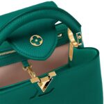 The Maison reinterprets the Capucines BB handbag this season in a glowing emerald hue, a colorway at once bold and feminine. Crafted from full-grain Taurillon leather and accented with finely fashioned gold-finish hardware, this compact model moves gracefully from day to evening. The bag’s wide, detachable strap is perfect for over-the-shoulder or cross-body wear.