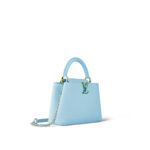 An iridescent finish on the LV Initials and on the braided chain creates a striking contrast with the elegantly simple colorway of the Taurillon leather on this Capucines BB handbag. The jewel-like handle rings, with their rivets, have this same “beetle shell” aspect. These metallic details bring a pop touch to this iconic bag.
