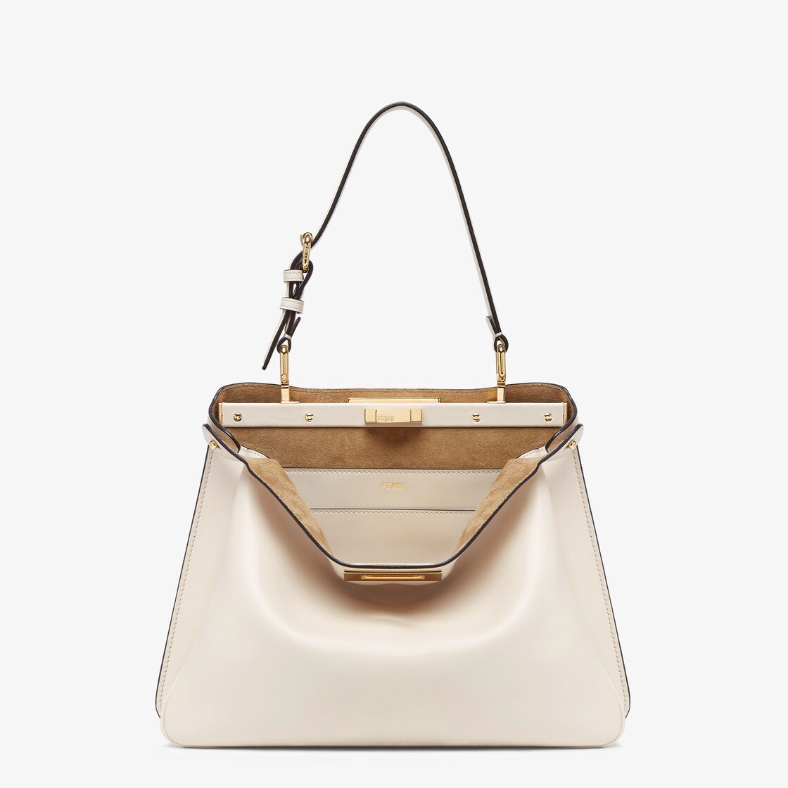 Featuring a suede-lined interior with two internal compartments divided by a stiff partition and a leather internal pocket with gold-colored FENDI logo print.
