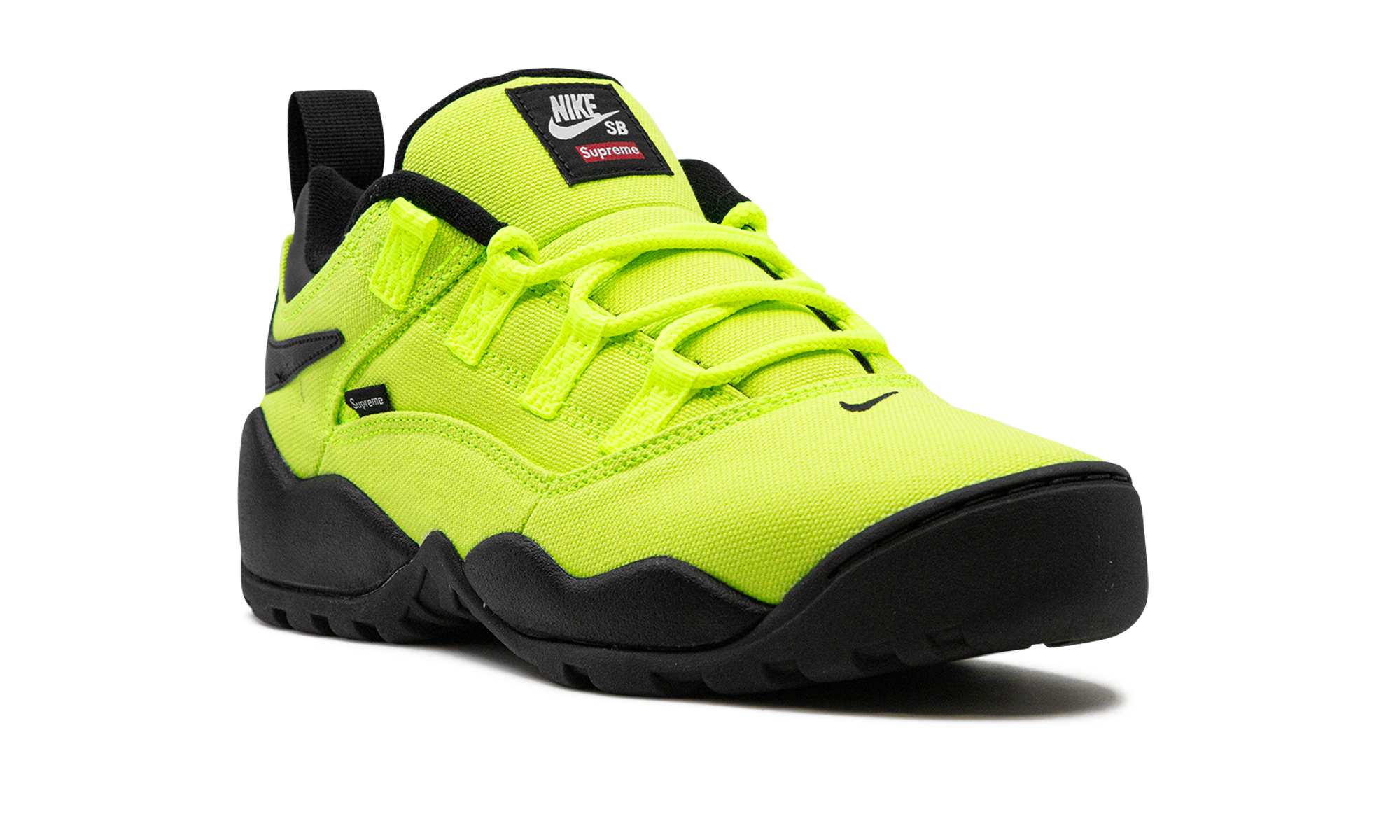 The Supreme x Nike SB Darwin Low “Volt” is a collaboration by the popular streetwear brand on an eye-grabbing, neon green colorway of the retro sneaker. The Nike Darwin was designed by legendary Nike footwear designer Tinker Hatfield and worn by Dennis Rodman in the NBA before it became indoctrinated into the skateboarding world thereafter. Supreme and Nike SB team up to bring back the classic 1990s-era shoe with skate-friendly updates. The “Volt” colorway features a Volt-colored canvas construction with a black reversed Swoosh on the collar. A “Supreme” branded tag is seen on the lateral side of the shoe. Co-branding appears on the tongue.